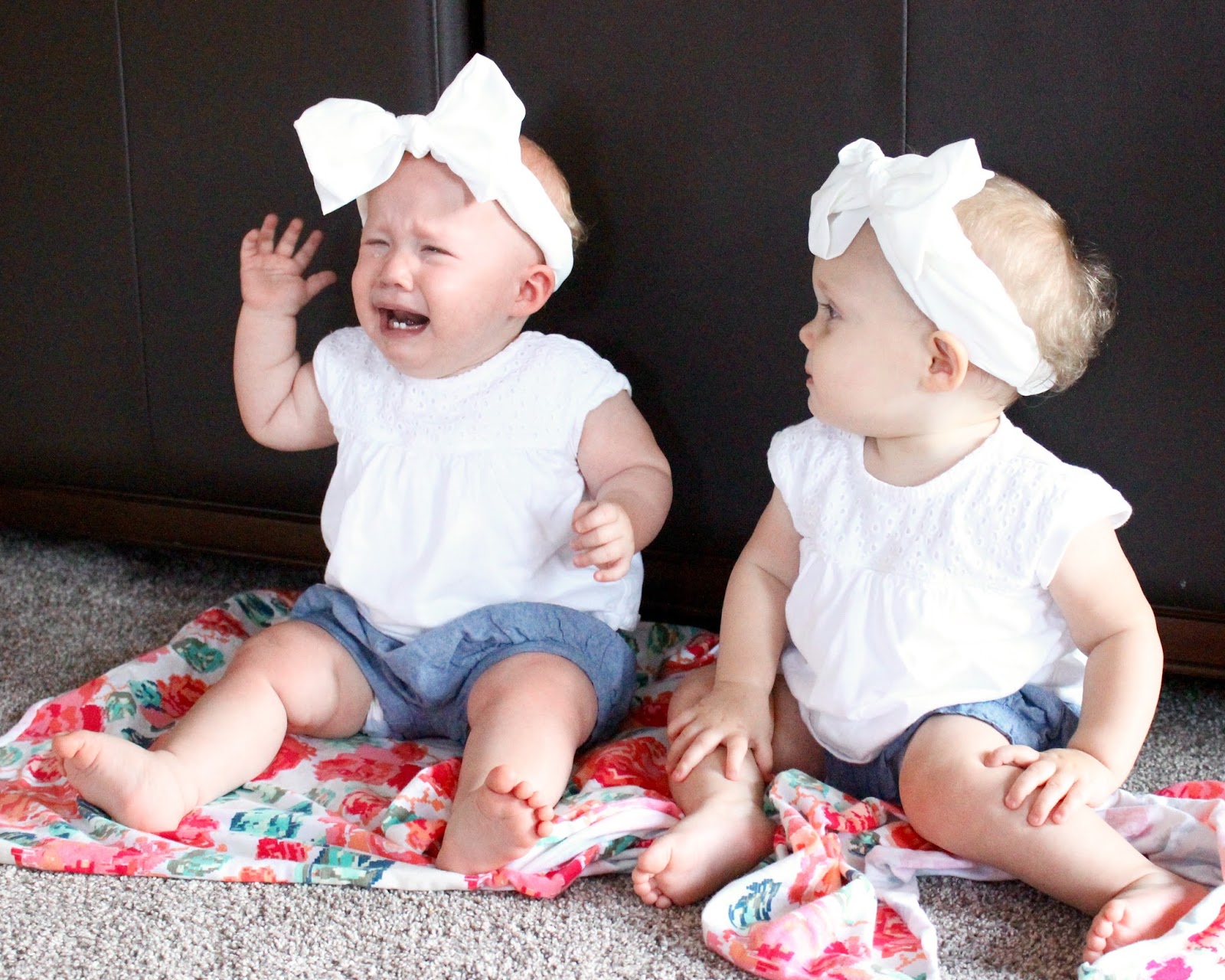 Even though they fight over toys sometimes, they also really like to share too. In their carseats they always pass toys to one another. They like eating off one another's trays and like putting/taking food from one another's mouths (sometimes ending in bitten fingers). And in their cribs they pass toys and blankets. Mommy puts the same blankets in each crib and each morning we look to see what blankets are where - they're always mixed up. Jacqueline always ends up with more cause she really likes snuggling blankies. And we like to peek in and see the girls facing each other and chatting in their cribs - they really are best friends. But best friends still fight over toys.